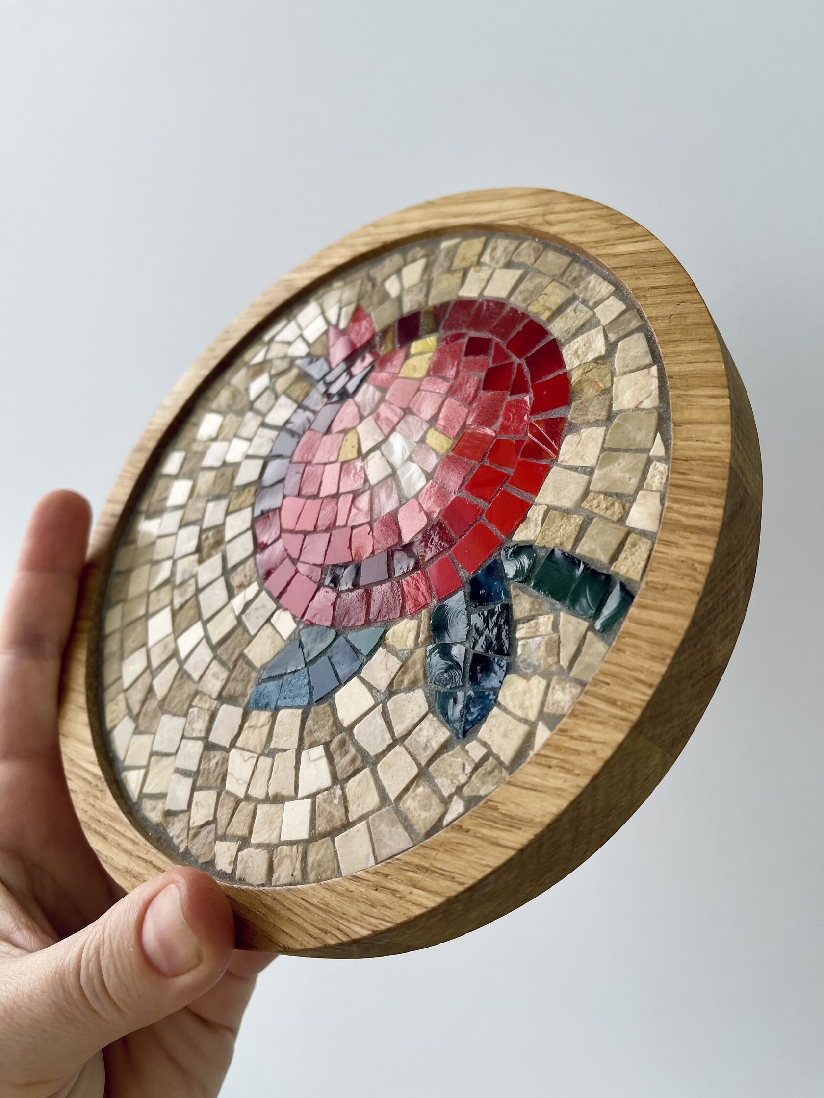 Материалы: деревянная форма, инкрустация мозаики из смальты, мрамора и художественного стекла.